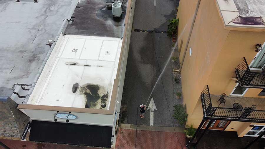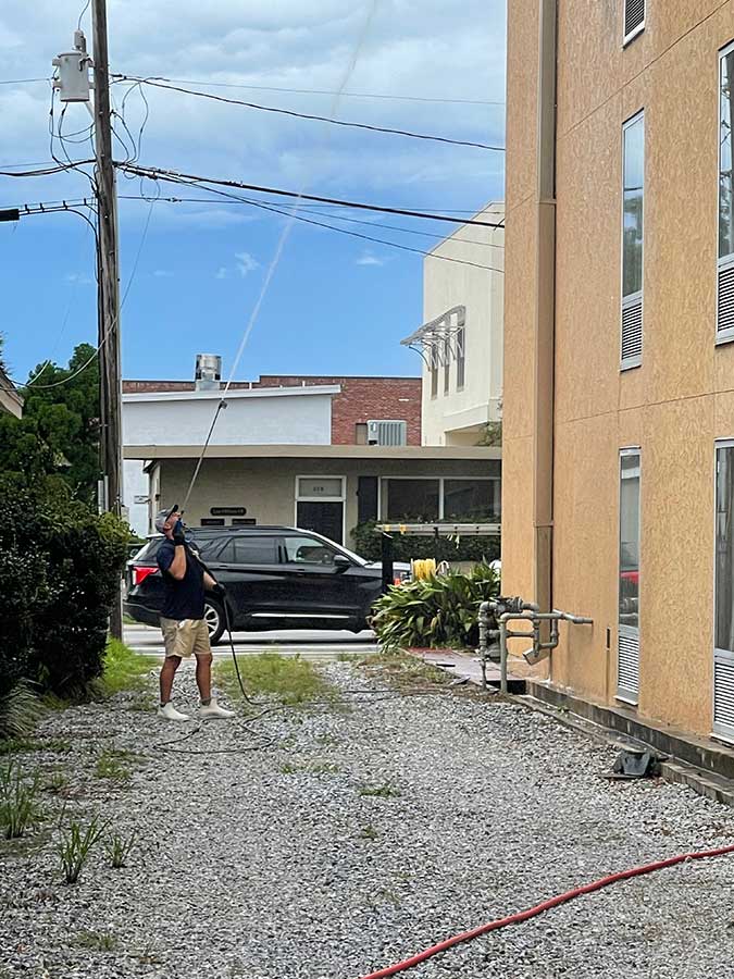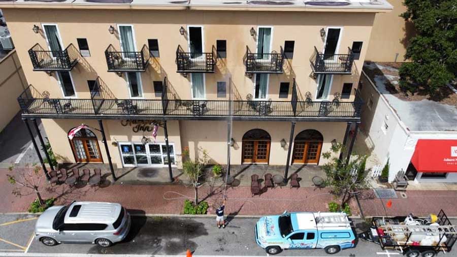 We were contacted by the Hampton Inn located in downtown Fairhope to clean the exterior of their four-story building. Using our commercial grade soft washing system, we could get the building cleaned without the use of lifts or ladders.